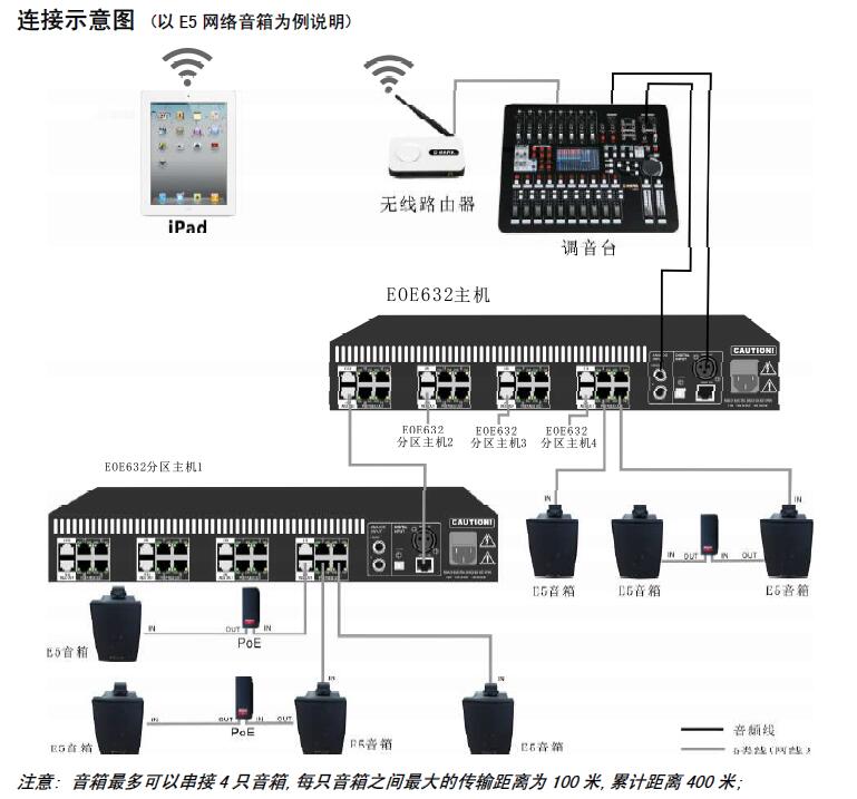 主要特點(diǎn) 1) 主機(jī)支持AES/EBU 和光纖數(shù)字音頻信號(hào)二選一輸入,提供單獨(dú)的分區(qū)連機(jī)RJ45 接口。數(shù)字音頻信號(hào)與模擬立體聲音頻信號(hào)可同時(shí)輸入,具有混音功能,信號(hào)比例由音源前級(jí)調(diào)節(jié)。 2) 主機(jī)8 分區(qū)獨(dú)立音量控制電位器,可方便靈活調(diào)節(jié)每個(gè)分區(qū)的音量,內(nèi)置4 個(gè)獨(dú)立的開(kāi)關(guān)電源,每4 個(gè)音箱采用一個(gè)電源供電。 3) 主機(jī)可提供8 組16 路的音箱連接接口,8 路數(shù)字信號(hào)輸出接口。 4) 主機(jī)與音箱連接采用一條普通的CAT5-6 網(wǎng)線及RJ45 水晶頭即可,工程安裝簡(jiǎn)單易用。 5) 提供獨(dú)立的電源適配器,如主機(jī)電源供應(yīng)接口不夠,可通過(guò)電源適配器將8 路數(shù)字信號(hào)擴(kuò)展為E5/EX6/EU35 音箱供電接口。 6) 音箱具有一個(gè)輸入接口,和一個(gè)數(shù)字信號(hào)輸出接口,可通過(guò)我司的電源適配器轉(zhuǎn)接下一只E5/EX6/EU35 音箱。 7)音箱通過(guò)電源適配器可串接4 個(gè)E5/EX6/EU35 音箱。理論上一臺(tái)主機(jī)EOE632(16 路+8 路)*4 可接96 只E5/EX6/EU35 音箱,主機(jī)到E5/EX6/EU35 音箱的最長(zhǎng)距離為100 米網(wǎng)線。 8)音箱具有L、L+R、R 通道選擇開(kāi)關(guān),通過(guò)該開(kāi)關(guān)可將兩只音箱組成一套立體聲聲場(chǎng)輸出。